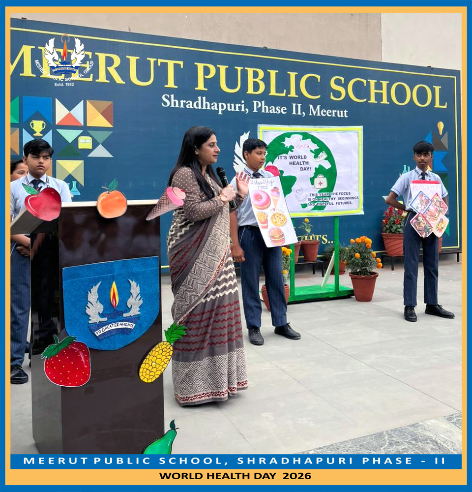 World Health Day was celebrated at MPS Shradhapuri-II with awareness and active participation through a special assembly. Balvatika students captivated everyone with a lively poem on healthy food, while a Grade VIII student delivered a confident speech highlighting the importance of making healthy food choices.