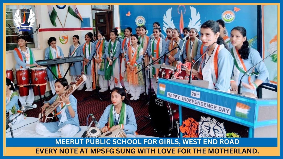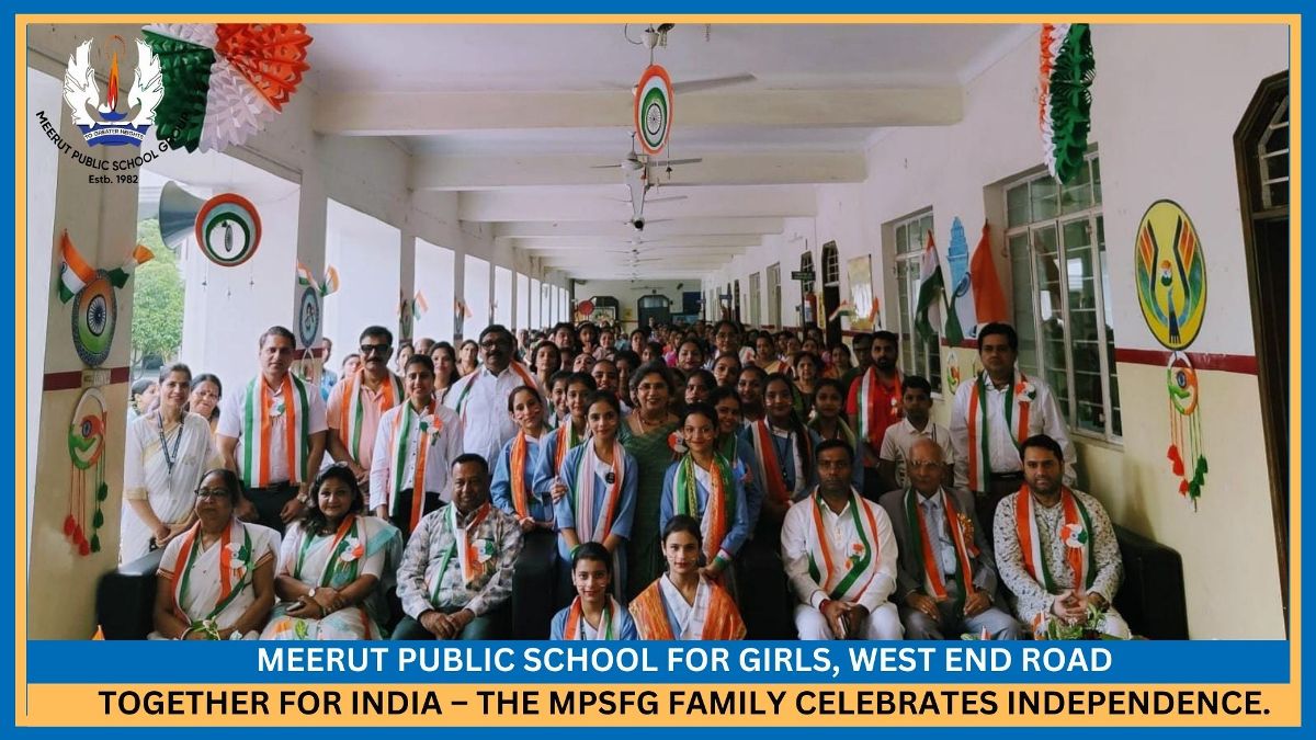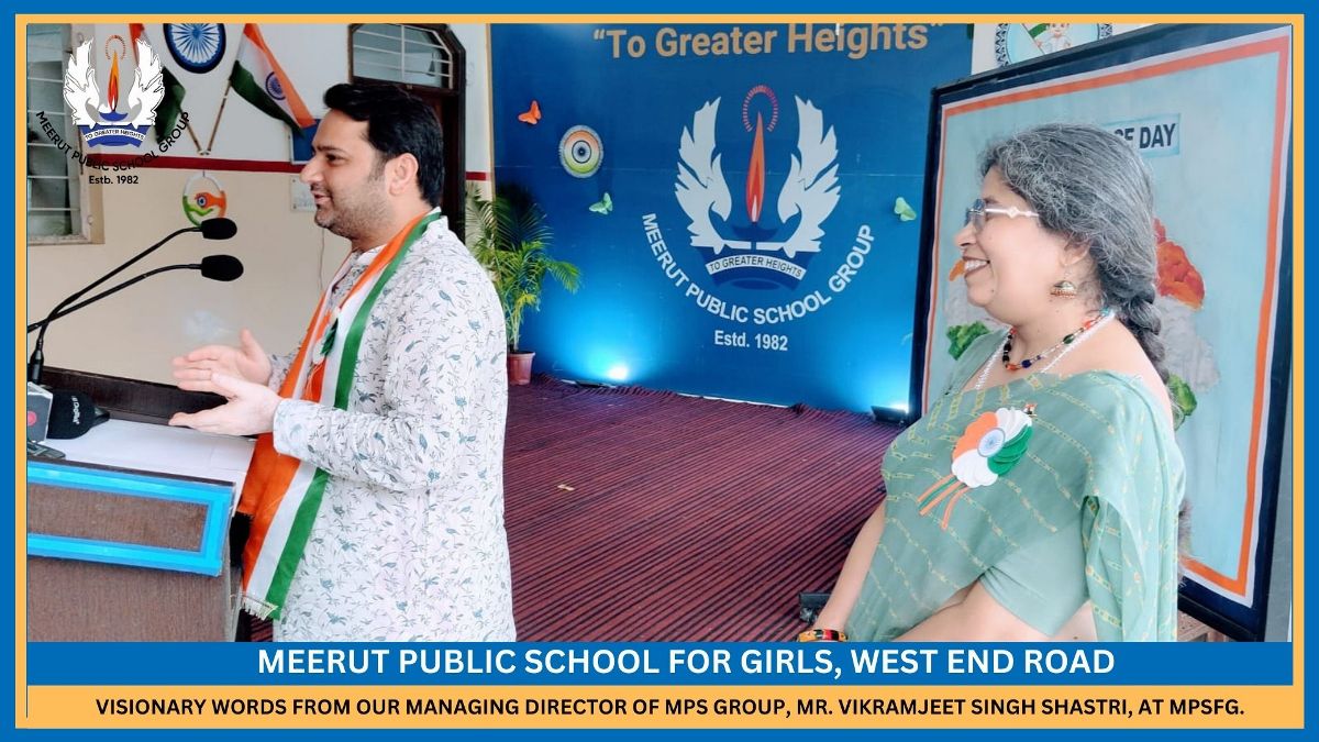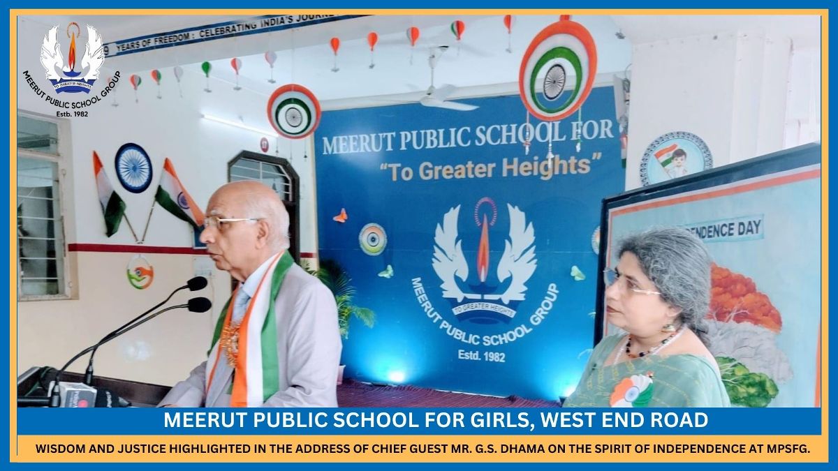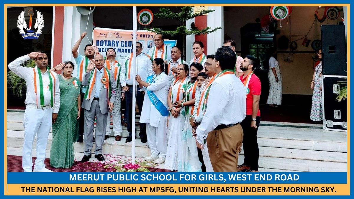 Meerut Public School for Girls celebrated the 79th Independence Day in an atmosphere brimming with patriotism and a collective commitment to national responsibility. The Chief Guest, Senior Advocate and Past District Governor of Rotary Club Meerut Mahan, Mr. G.S. Dhama, was joined by Dr. K.P. Saini (President), Mr. Puneet Kathuria (Secretary), Ms. Sangeeta Kumar (Past District Governor), Mr. Vikas Jain (Treasurer), and other esteemed members of Rotary Club Meerut Mahan. The presence of the Managing Director of MPS Group, Mr. Vikramjeet Singh Shastri, further enriched the occasion. Guests were accorded a gracious welcome with tri-colour stoles, badges, and saplings — a gesture symbolising honour and the school’s commitment to environmental stewardship.