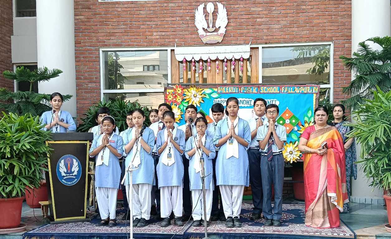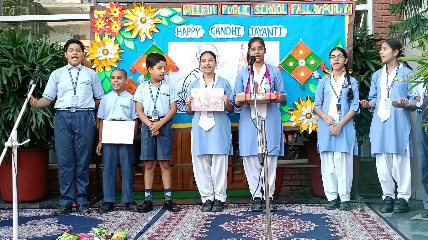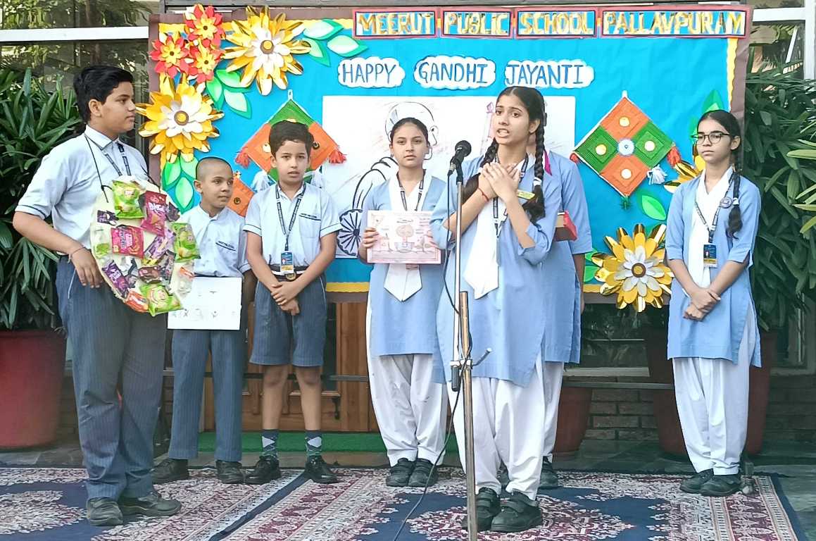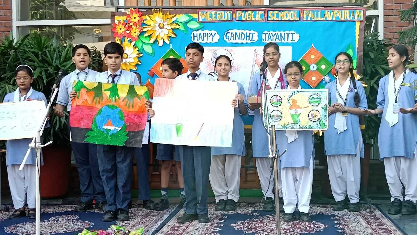 Meerut Public School, Pallavpuram conducted a special assembly to commemorate Gandhi Jayanti and Lal Bahadur Shastri Jayanti. Students presented speeches, a skit highlighting the values of cleanliness, peace, and patriotism, reinforcing Gandhi Ji's vision of "Swachh Bharat."
