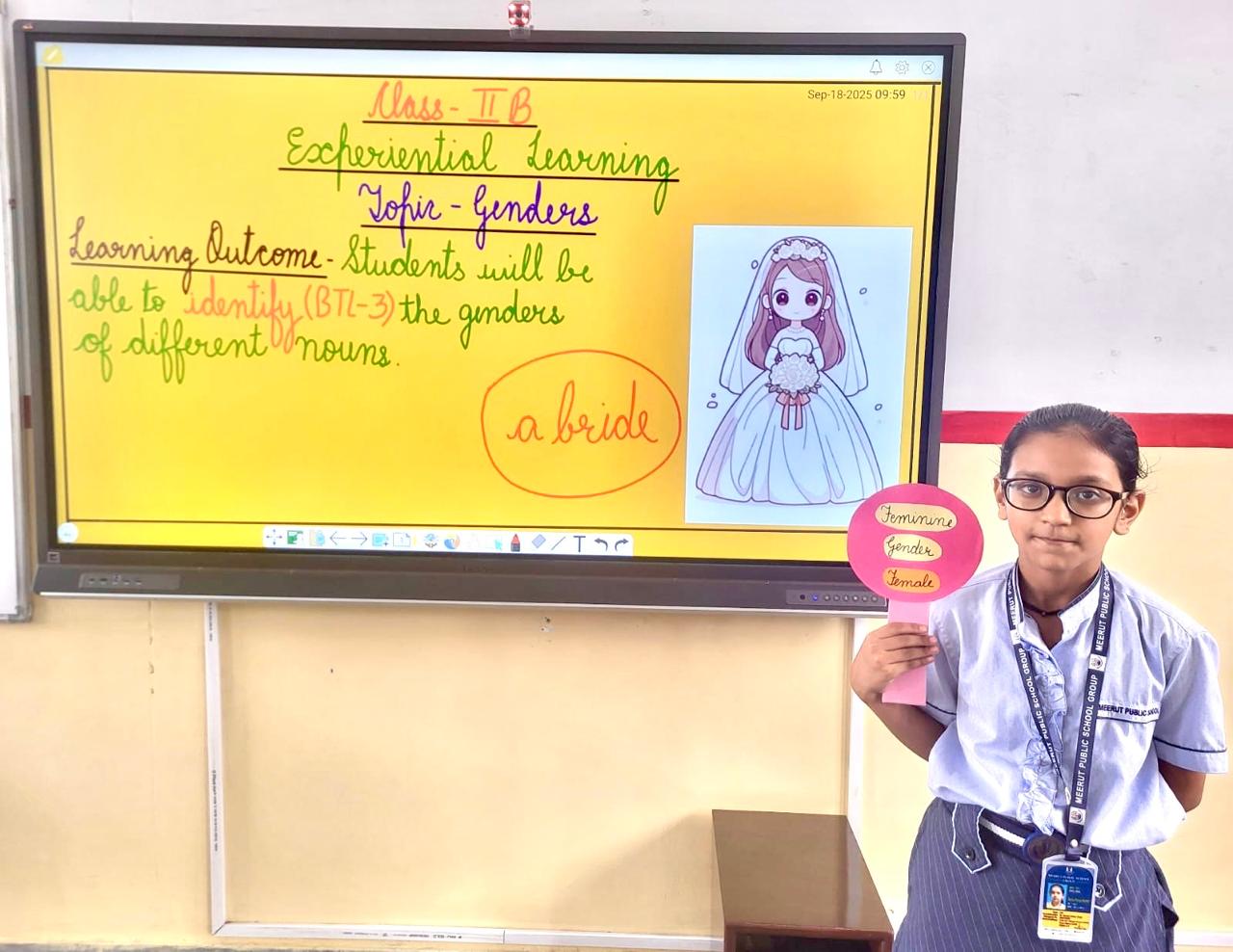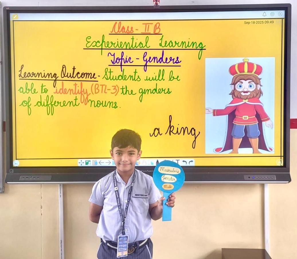 Students of Grade 2 engaged in an experiential learning activity on Genders. Different nouns were presented to them on the smart panel, and they enthusiastically identified the correct gender using flash cards. This interactive method made grammar learning simple, clear, and fun while building confidence in recognizing masculine and feminine nouns.