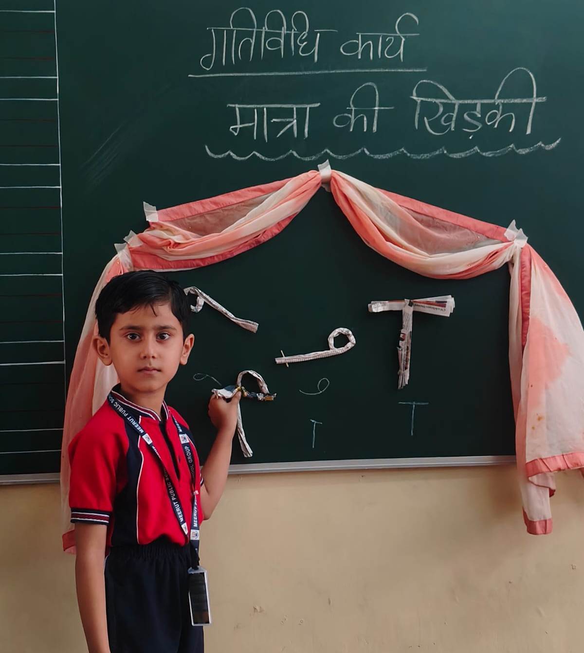 छात्र पुराने अखबार का प्रयोग करके उन्हें मात्रा का रूप देकर स्वर के चिन्ह को दर्शाने में सफल हुए | इस गतिविधि से छात्रों ने पुराने अखबार का प्रयोग सीखा तथा पर्यावरण का ध्यान रखना सीखा और मात्रा सीखी |