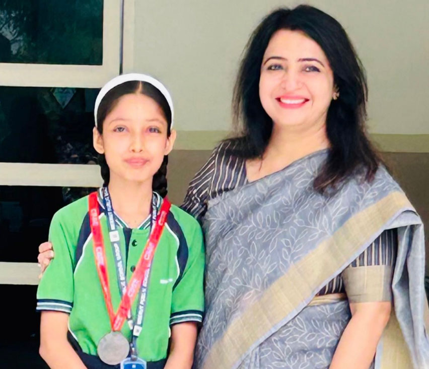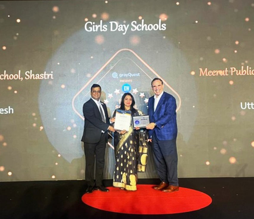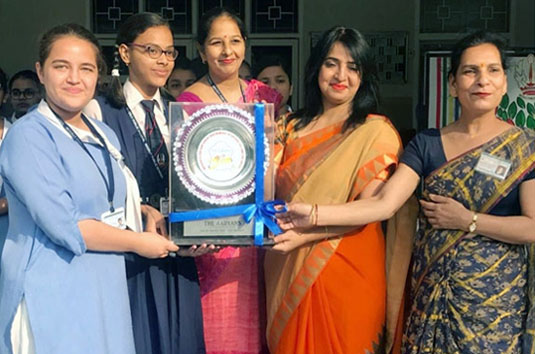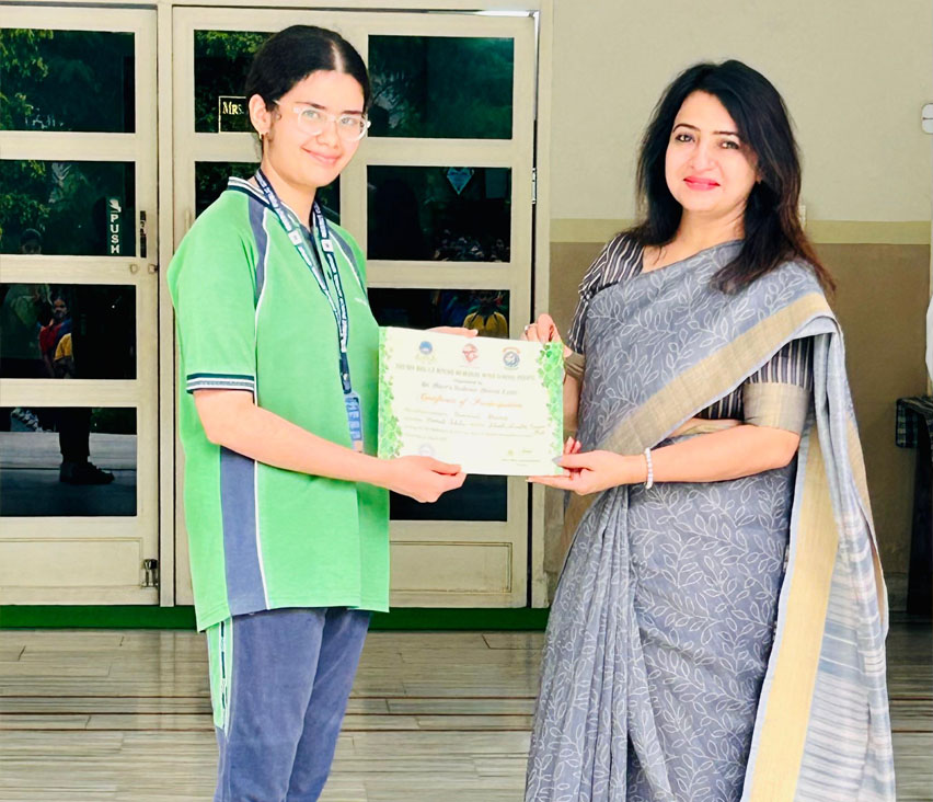 Khushi Patwal and teacher Ms. Nupur Sharma were felicitated with Gyan Kunj Award and Bhasha Sarthi Award respectively by Hindi Vikas Manch at Air Force Auditorium, Subroto Park, Delhi.