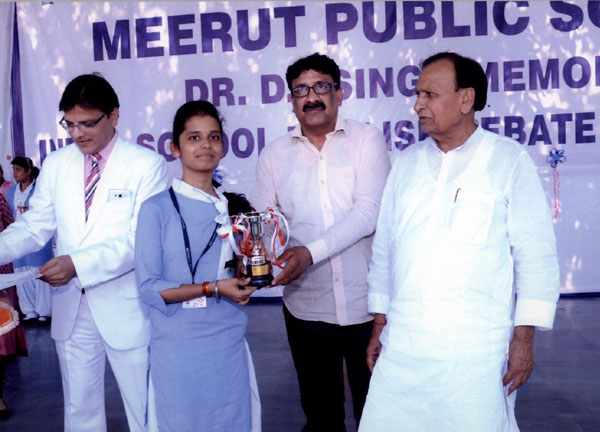 Srishti Aren receiving best speaker trophy in Inter School English Debate Competition organized by M.P.S main wing.