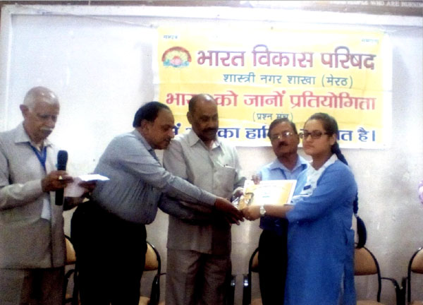 Tanisha mathur was felicitated with All Rounder Student Trophy by 'Bharat Vikas Parishad'.