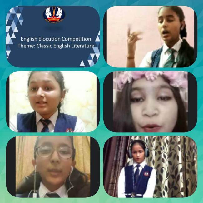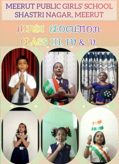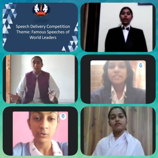 The students of classes 3rd, 4th and 5th  took part in *Hindi Elocution Competition on the  theme "Haasya Ras/Veer Ras" under the group C. The humorous recitals of the students left the audience with smiling faces. Group D having the students of classes 6th, 7th and 8th had *English Elocution Competition* on the theme Classic English literature.  The audience traversed through the memory lane. The students of classes 9th and 10th comprising Group E participated in *Speech Delivery Competition* and their theme was the Famous Speeches of World Leaders. The Wonderful performances of the students left everybody awestruck.  Group F comprising the students of classes XI and XII participated in *English Debate Competition*. The confidence and convincing power of the budding debaters impressed all .
