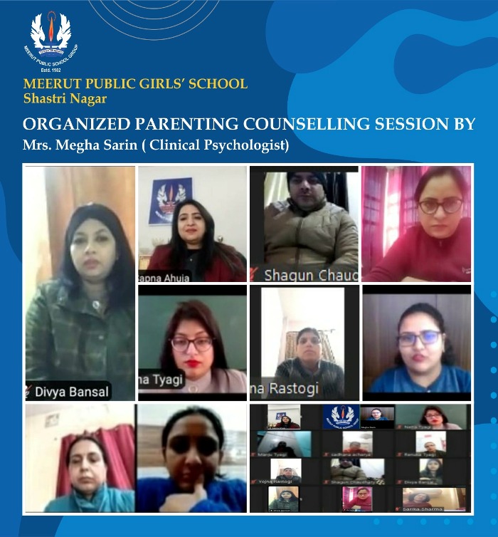Parents are the unsung heroes of every person that has ever done anything great and so to sow the seeds of greatness in lives of young minds . Continuous counselling of the parents is crucial as they learn to cope with their personal inadequacies and their feelings of guilt and stress.Changes and challenges in our child's environment can cause immense stress that can alter the way they function and interact . Aside from tending to the daily needs of the child, parents are also responsible for helping develop social skills, life skills and appropriate behaviour . Keeping this view in mind, Meerut Public Girls' School, Shastri Nagar, Meerut organised a Virtual Counselling Session for the parents of classes VI to VIII on 28 January , 2022 by Mrs Megha Sarin , accredited counsellor and former consultant at Fortis, Noida  and presently working with Meerut Public School- Group whose unparalleled personalized support and holistic approach helped parents to navigate difficult phases by empowering them with the right tools and strategies to bridge gaps and achieve best possible outcome academically, emotionally, socially and personally.