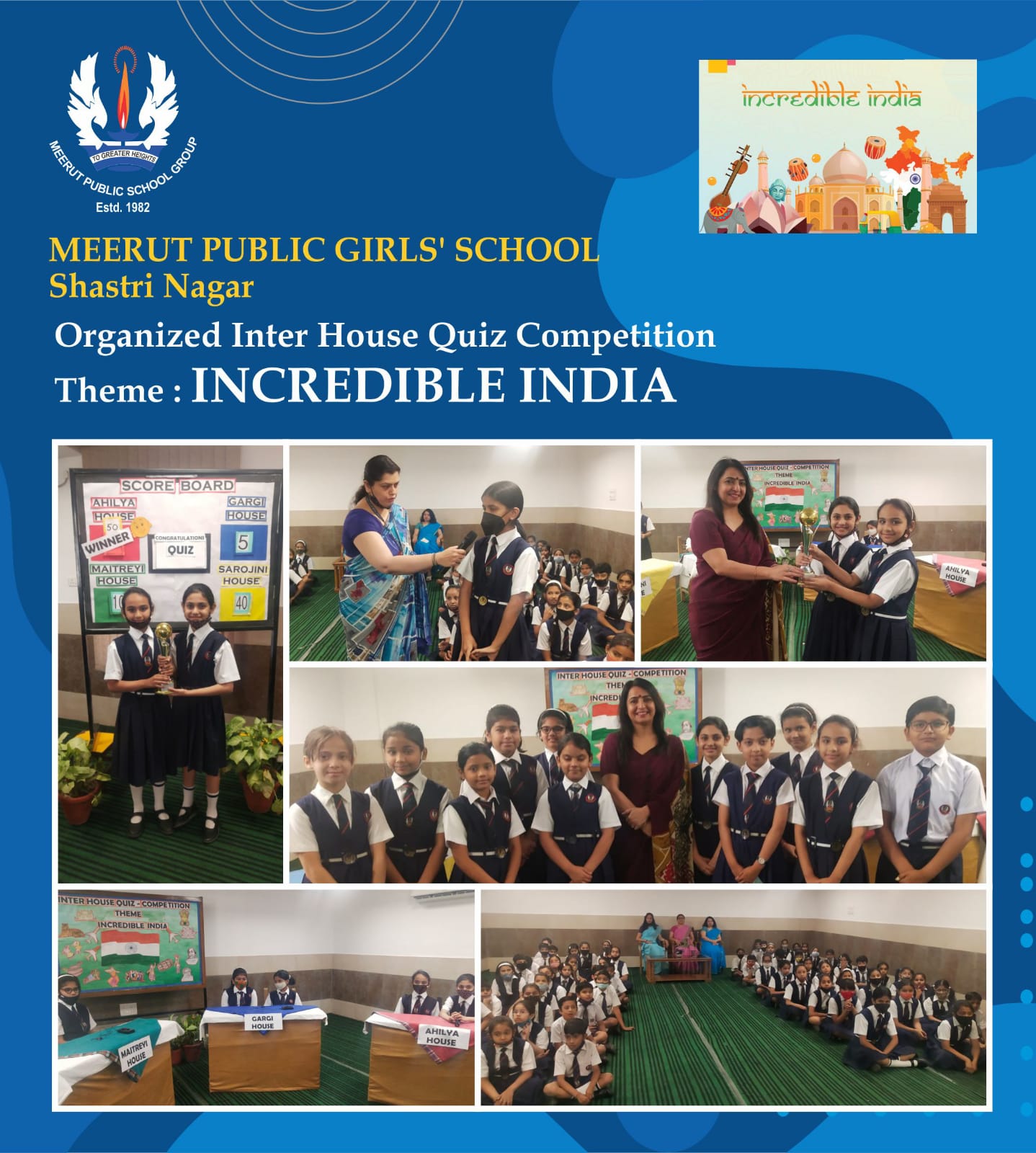 With the same perspective , MPGS Shastri Nagar organized an Inter House Quiz Competition based on the theme ' Incredible India ' for the students of the Primary Section . The participants of all the houses gave a good challenge to one another . It was really a treat to eyes and a great elation to heart to see that all the participants answered so enthusiastically and intelligently . There were three rounds. True & False, Picture Perfect and  The Fastest Finger . In the final round the tables turned . Zafra Khan and Pihu Tomer of Ahilya House secured the first position  whereas  Anaysha Tyagi and Aagam Jain  of Sarojini House stood at the second position with their deep insight and promptness .