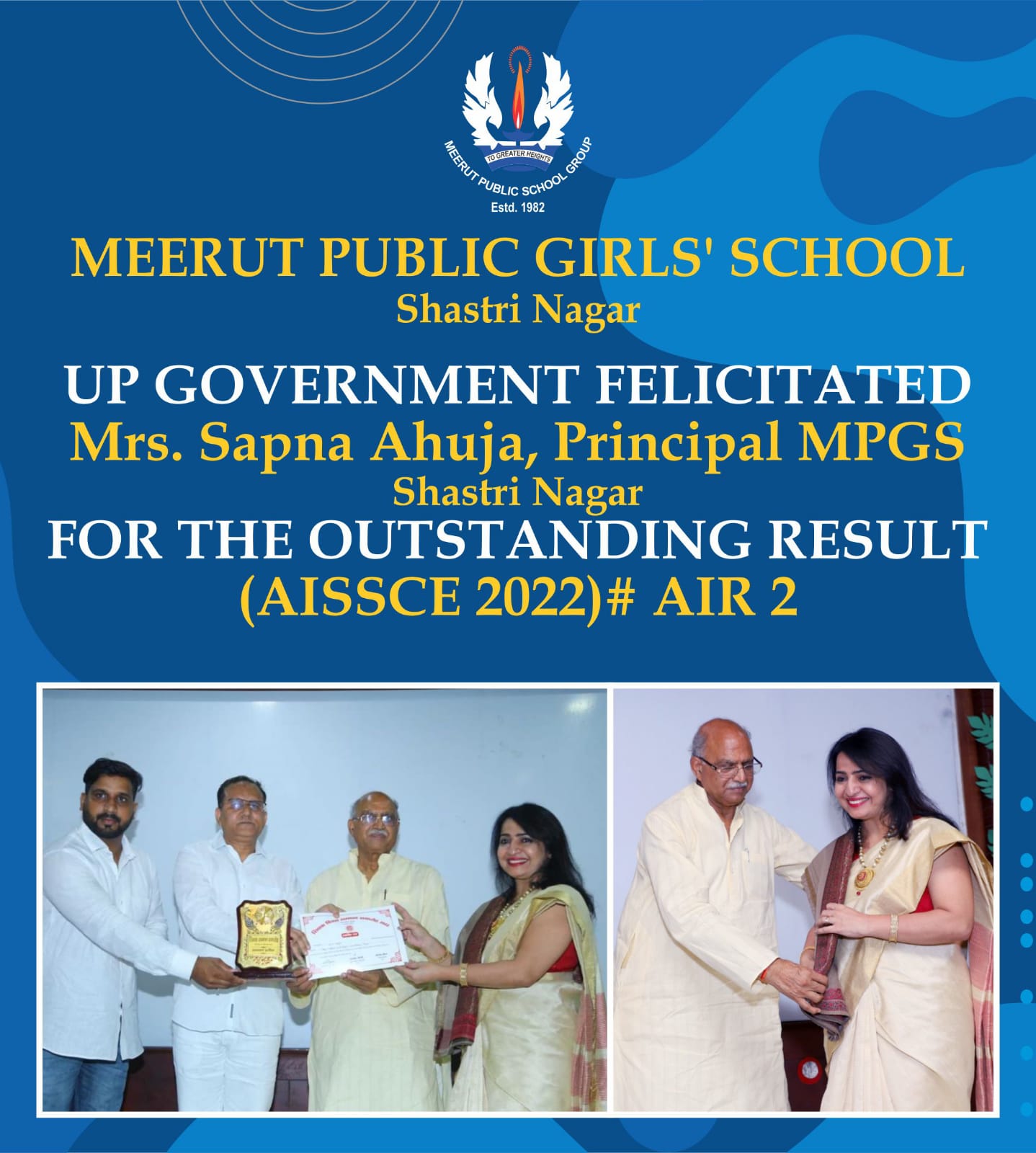 On behalf of the CM , MLA Shri Amit Agarwal and MLC Shri Dharmendra Bhardwaj felicitated Madam Principal with a citation, a  memento and a shawl for the outstanding result  in AISSCE 2022, AIR 2 , secured by Anshika Poswal under the aegis of venerable Madam Principal. The great piece of news gleamed in all media.