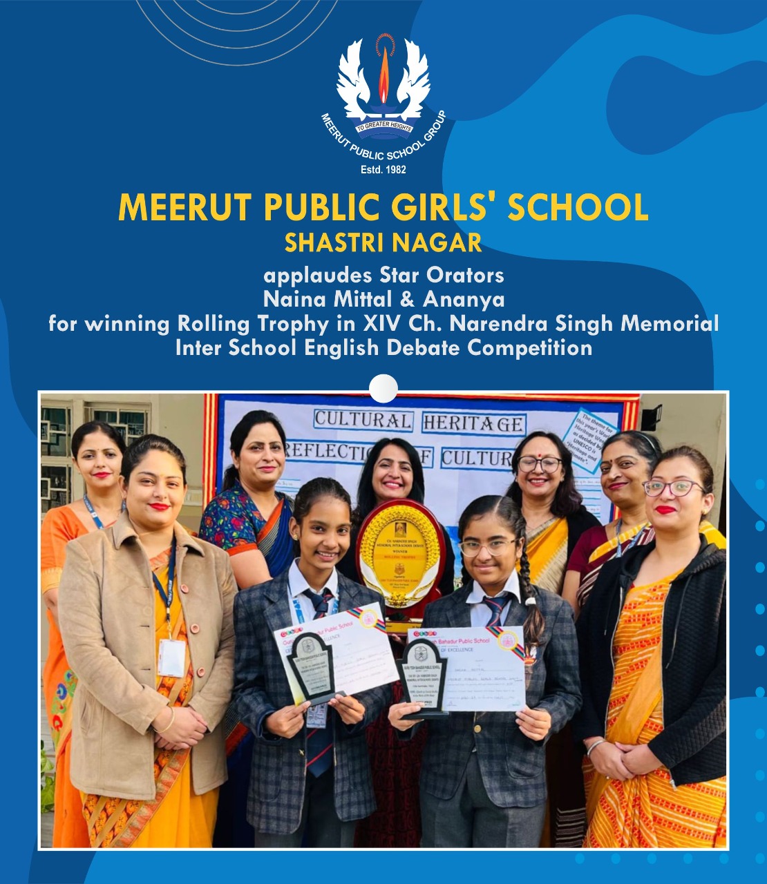 The aurora over the skyline came across luminously when Meerut Public Girls School, Shastri Nagar won the Rolling Trophy in the XIV Ch. Narendra Singh Memorial Inter-School Debate Competition organized at Guru Tegh Bahadur Public School, Meerut Cantt. on 16 November 2022. Our star orators, Naina Mittal of class VIII D and Ananya of VIII E secured first and second prizes by expressing their views 'for' and 'against' the motion "Check on Social Media is the Need of the Hour" respectively, outweighing the other participants from 26 schools of Meerut.