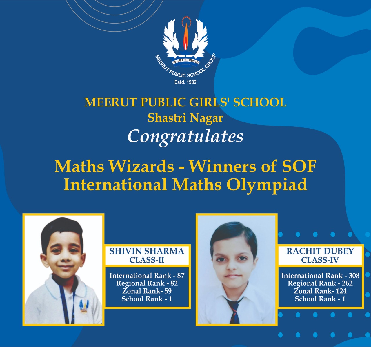 Another laurel was brought to MPGS Shastri Nagar when its meritorious students brilliantly performed in the International Maths Olympiad. Shivin Sharma ( school rank 1 and zonal rank 59), Rachit Dubey ( school rank 1 and zonal rank 124), Vaani Sharma(school rank 1 and zonal rank 493), Janvi Chaudhary( school rank 1 and zonal rank 488), Prachi Gupta ( school rank 1), Palak Jain( school rank 1),  Avikansh( school rank 1), Manvik Saini, Amayra Hayat, Aradhya Bhardwaj, Mishika Tyagi, Isra Noor, Manya Prajapati, Gauri Sharma and Aditi Agarwal won gold medals in the International Maths Olympiad. Rachit Dubey, Vaani Sharma and Janvi Chaudhary have also qualified for the second level of the competition.