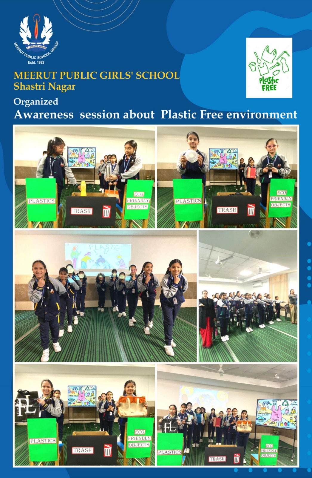 To make the students learn about the hazardous impacts of plastics on the environment and the eco-friendly alternatives to replace plastics,  MPGS Shastri Nagar conducted an activity  "Plastics Free environment"