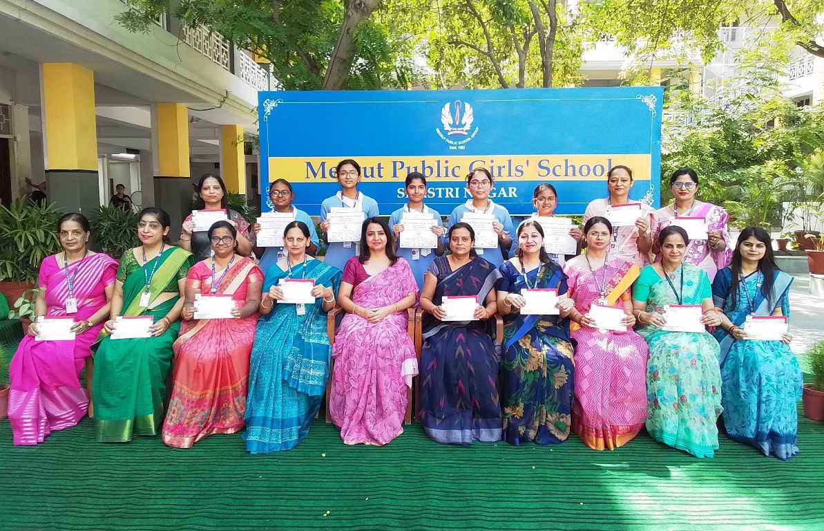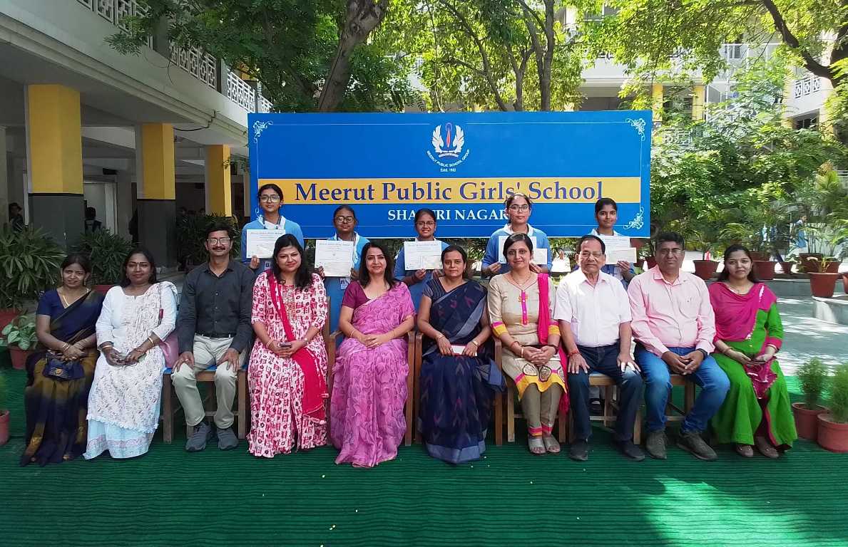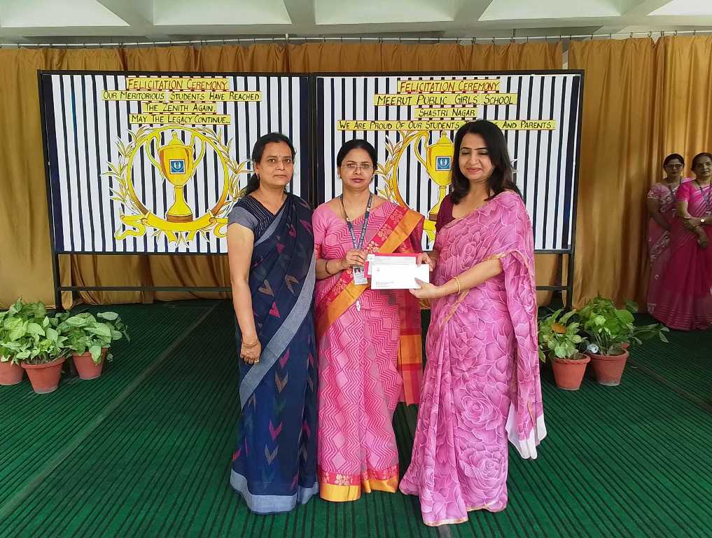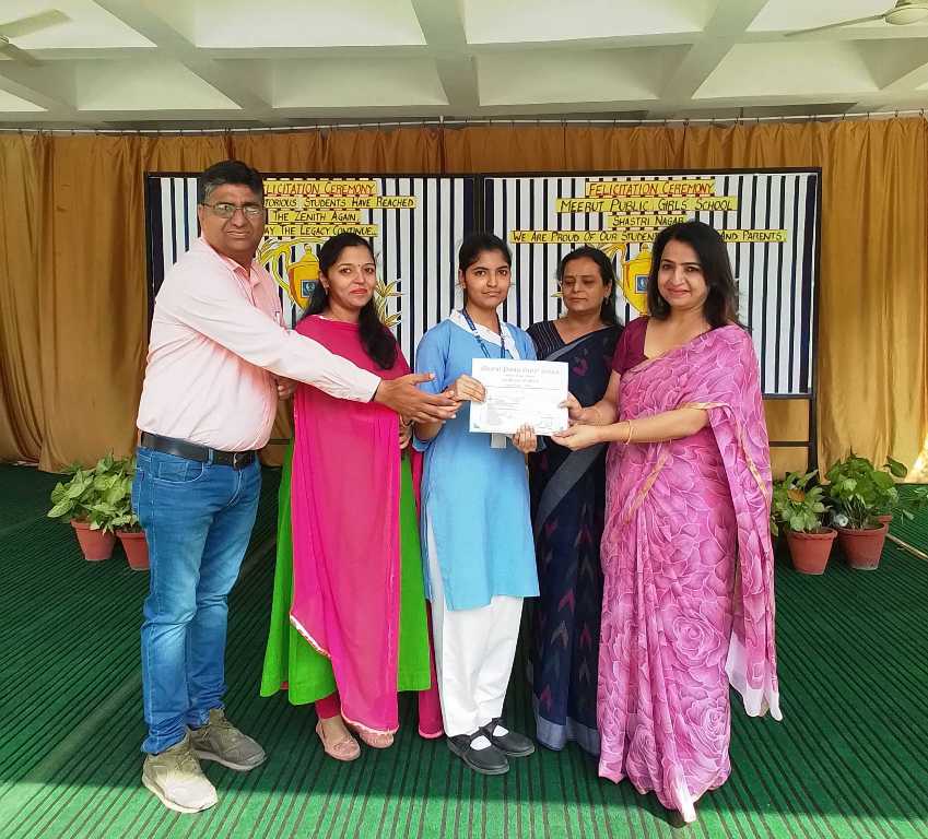Toppers Awards and felicitations are the most effective way to inspire for achieving academic excellence and to continue a constant journey to scale Greater Heights.MPGS Shastri Nagar felicitated the meritorious students of AISSE 2023 - Saumya Sharma, Suhani Mittal, Akriti Chandra, Taniya Bhardwai and Anubhuti Jain along with their parents and teachers to acknowledge their hard work, perseverance and astounding accomplishments.The event commenced with the chanting of the Gayatri Mantra followed by the welcome song. The toppers extended their reverence to their teachers and parents. Madam Principal congratulated and appreciated all the toppers, their parents and teachers. She also wished them to continue clambering to greater heights. The event culminated with the National Anthem.