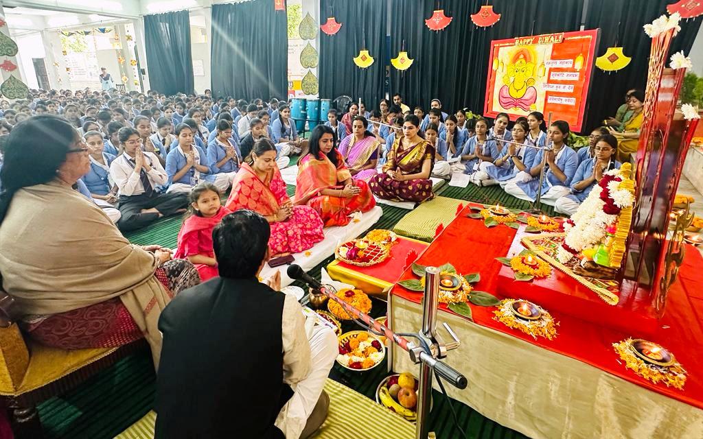 Meerut Public Girls' School, Shastri Nagar organized Deepawali Poojan to celebrate the festival of lights that gives the message" to remove the darkness of negativity by illuminating the light of positivity". The celebration commenced with worshipping Lakshmi - Ganesh by the Management, Principal Mrs. Sapna Ahuja, faculty and the students. The recital of hymns filled the ambience with holy vibes. The distribution of gifts and sweets spread the festivity and cheerfulness in the premises. The celebration culminated with the address of the Management and Madam Principal Mrs. Sapna Ahuja wishing all a happy, prosperous and safe green Deepawali.