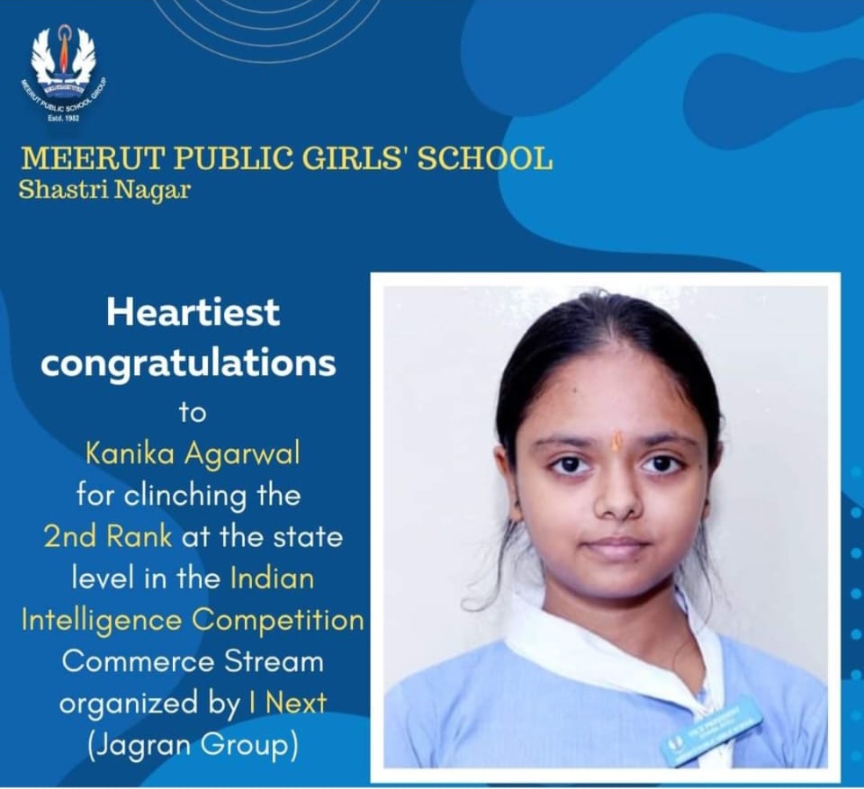 Kanika Aggarwal, an exemplary student from Class 12 at Meerut Public Girls’ School (Shastri Nagar), has brought immense pride to the institution by clinching the second rank at the state level in the Indian Intelligence Competition (Commerce Stream) organized by iNext (Jagran Group). The competition witnessed enthusiastic participation from bright minds representing approximately 100 schools across the state.