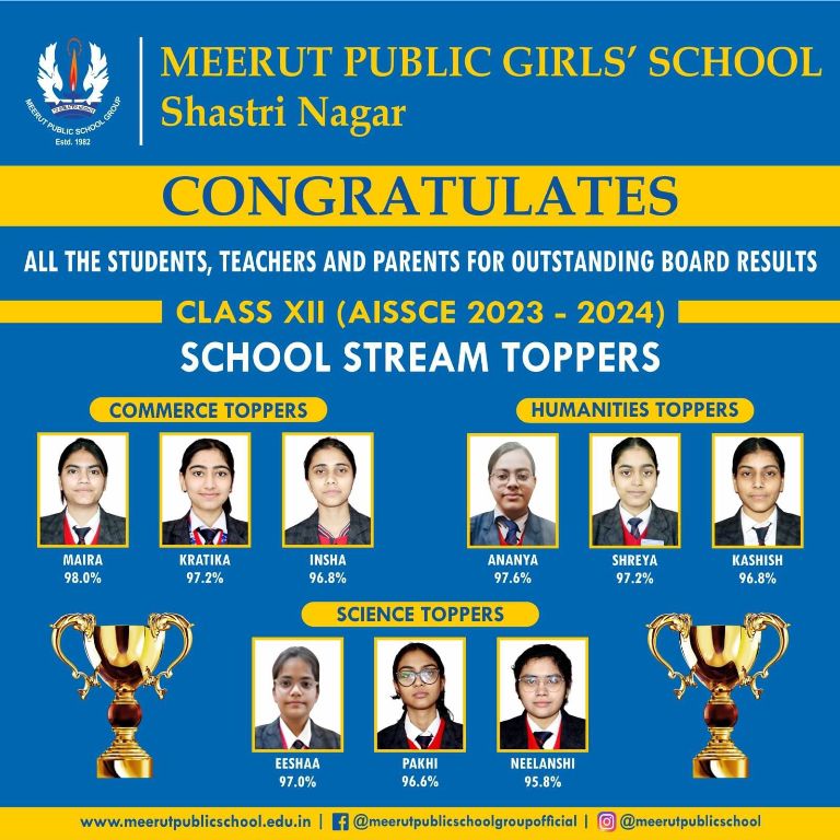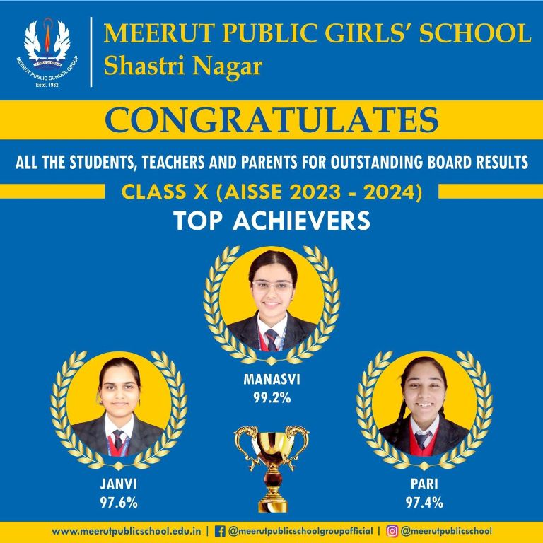 Excellence is never an accident.It is always the result of high intentions, sincere efforts and intelligent execution.It represents the wise choice of many alternatives - choice not chance, determines the destiny. Following the same perspective, Meerut Public Girls’ School, Shastri Nagar scaled another timeless academic achievement with the splendid results in AISSCE 2024 and AISSE 2024 . Imitating the great legacy of creating the toppers at National , State and District levels, the meritorious students of the school once again hoisted the success flag high. Another feather in the cap is the increasing number of ninety percent above scorers. The Management, the Principal and the faculty feel immensely elated and congratulate all the students who have brought laurels to the school.