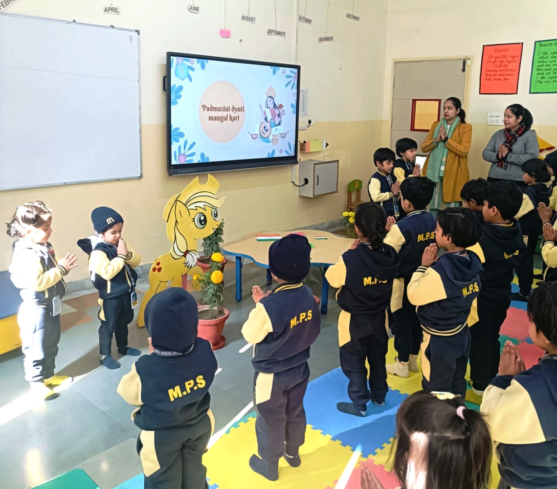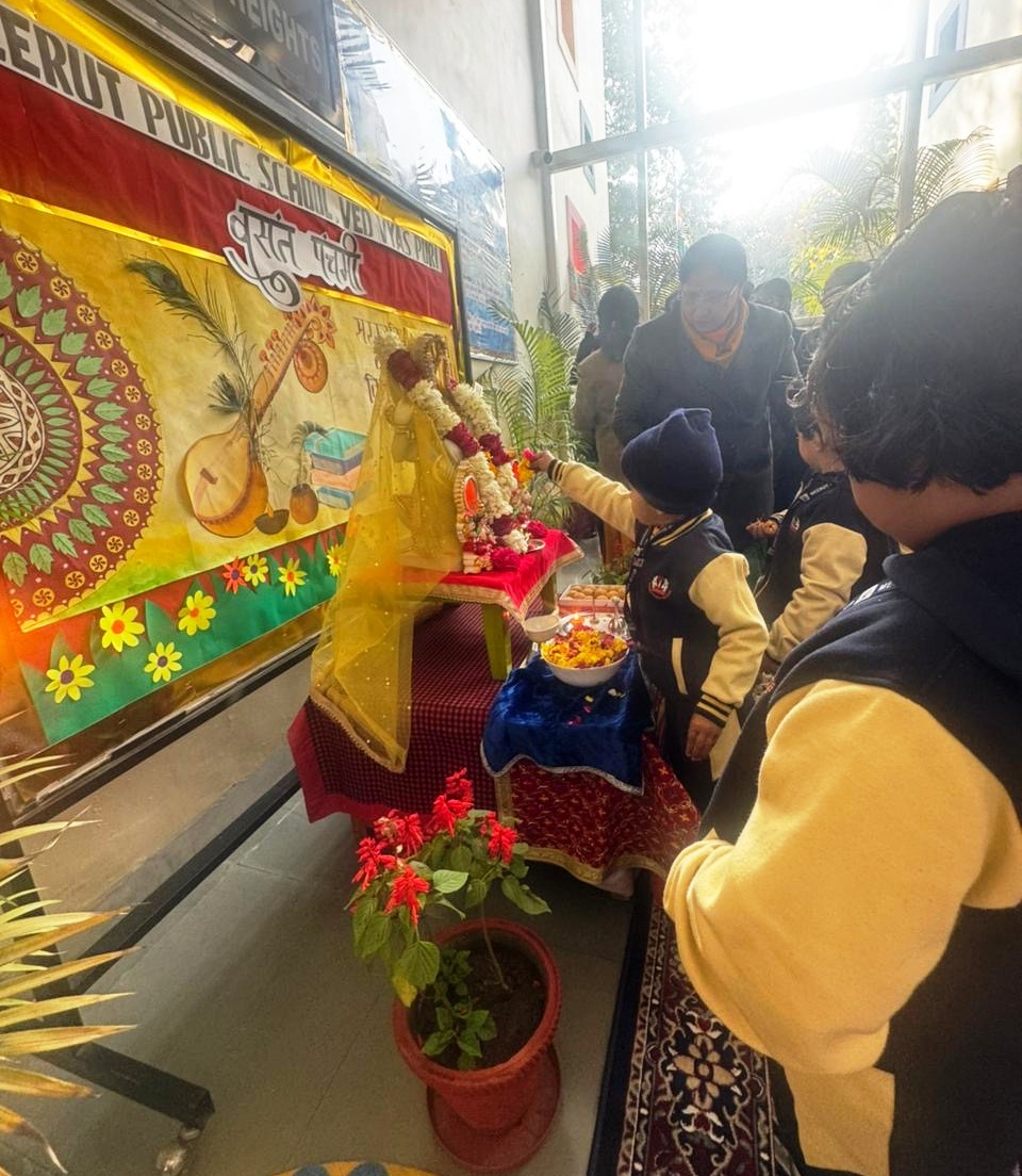 Meerut Public School, Ved Vyas Puri celebrated Basant Panchami with great devotion and enthusiasm. The celebrations began with Saraswati Pooja, where students gathered in reverence, followed by the soulful rendition of Saraswati Vandana, filling the campus with a serene and spiritual atmosphere.